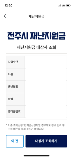 이후 전주 재난지원금 대상 조회 및 신청하기 클릭 후