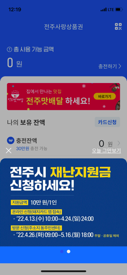 아래 사진처럼 전주사랑상품권 앱에 가서 재난지원금을 신청하셔야 해요.