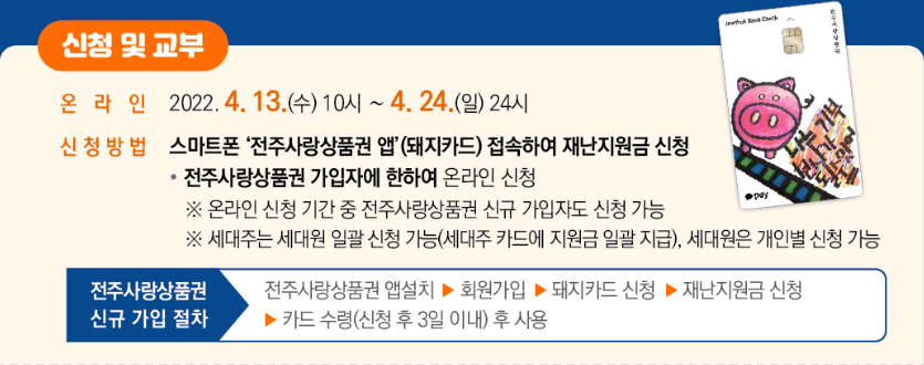 먼저 온라인으로 신청을 받는데 온라인으로 신청하기 위해서는 전주 지역화폐 카드인 돼지 카드가 있어야 해요.