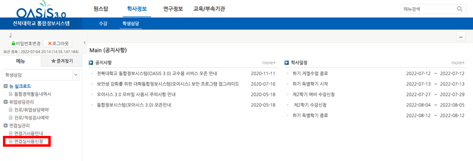 그리고 밑에 두 번째 사진처럼 [학사정보] - [학생상담]으로 들어가 주세요.