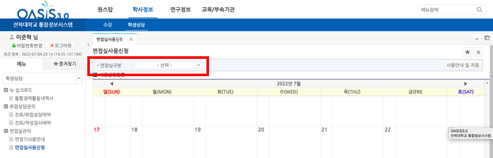 그리고 밑에 보이시는 것처럼 [면접실사용신청]을 클릭하신 후