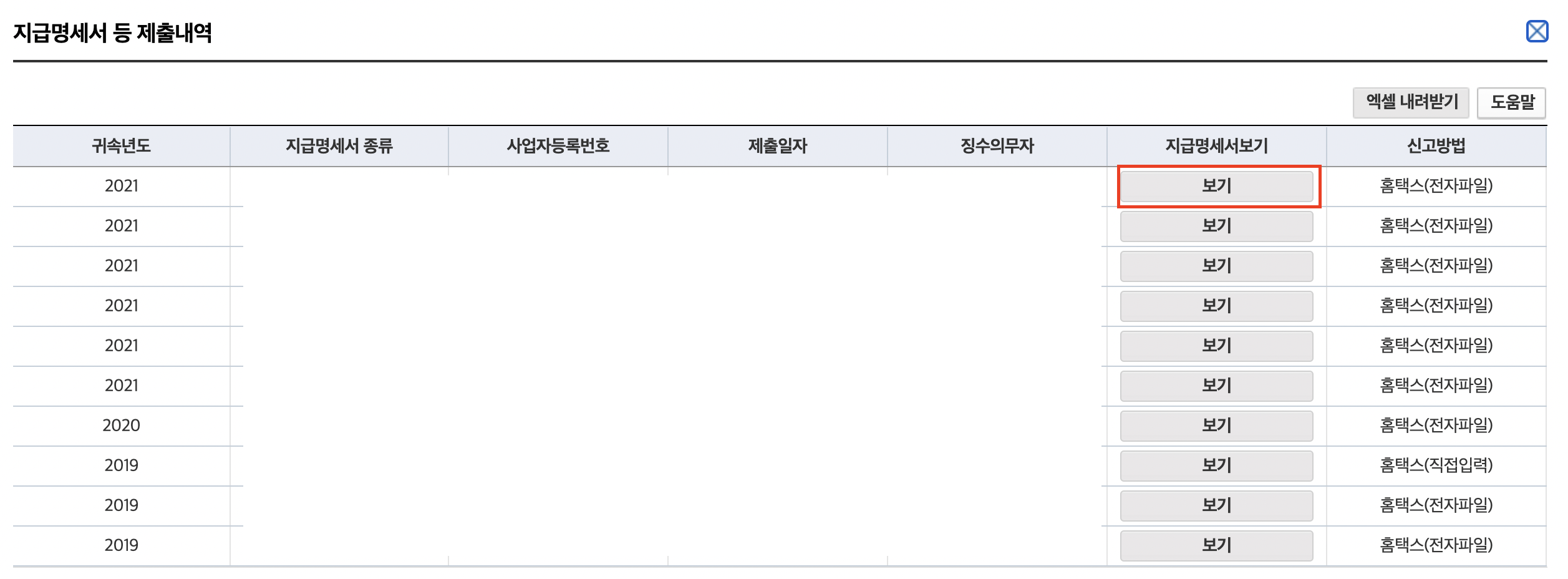 지급명세서 등 제출내역을 눌러주세요.