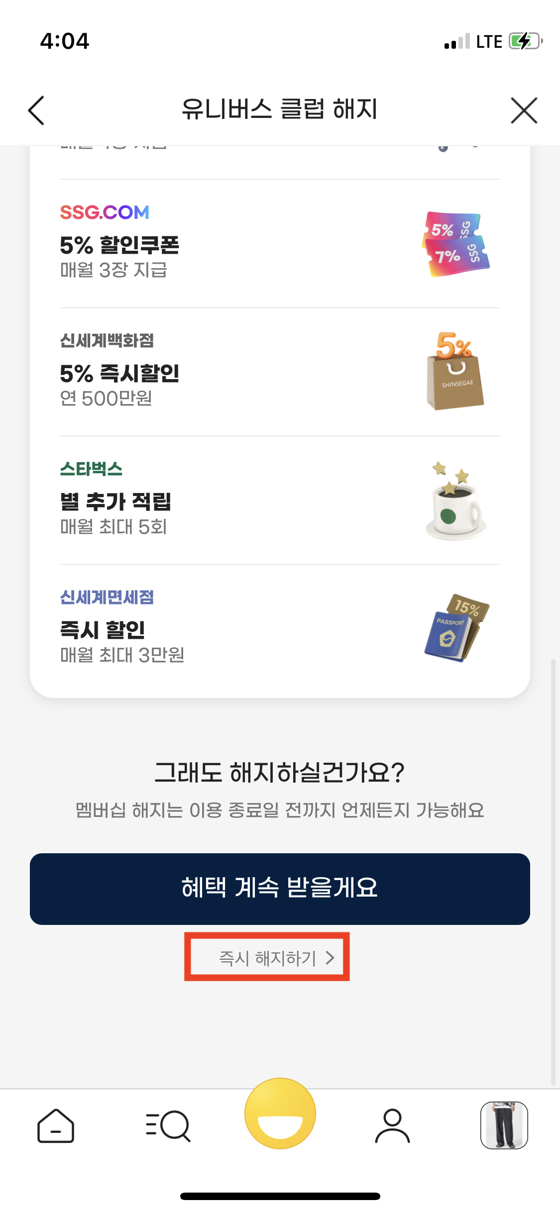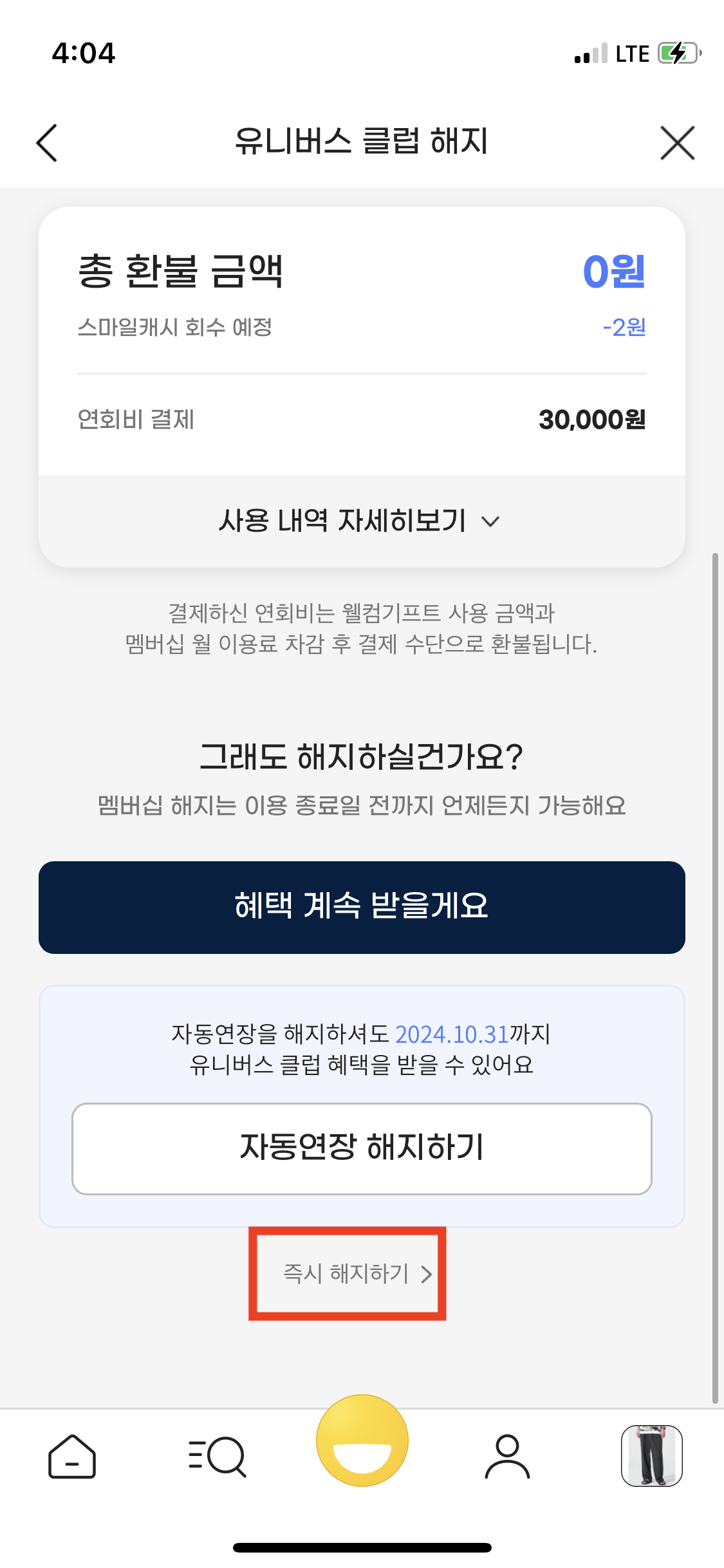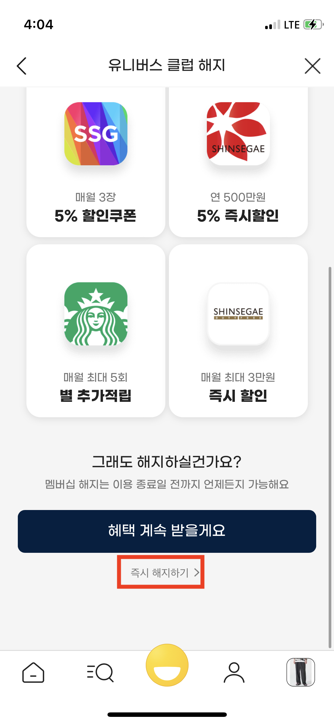 그리고 즉시 해지하기를 1번만 누르시고 나가도 유니버스 클럽이 유지가 되니