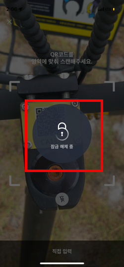 이 칸을 카카오바이크에 있는 QR코드에 가져가시면 뒤에 있는 잠금장치가 해제가 돼요.