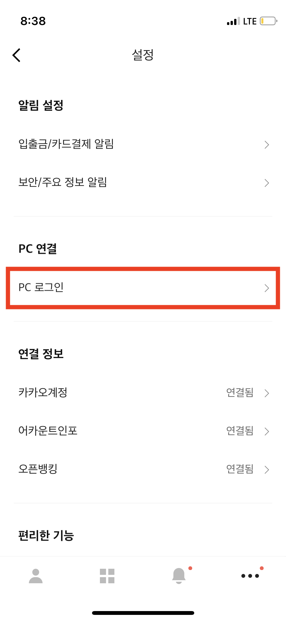 다시, 카카오뱅크 앱 - 더보기에서 [앱설정] - [PC로그인] - [QR코드 로그인]을 눌러서