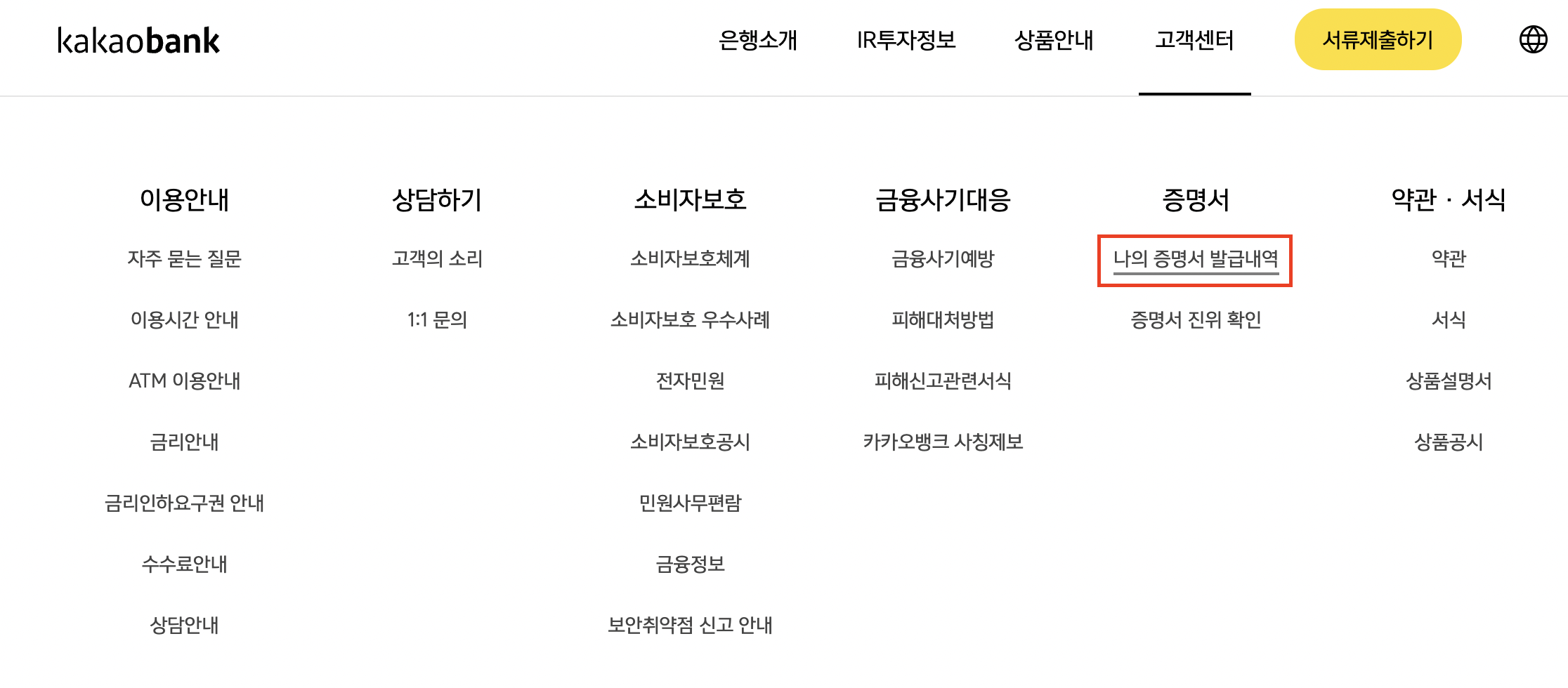 카카오뱅크 홈페이지로 들어가서 [증명서] - [나의 증명서 발급내역]을 눌러주세요.