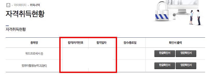 그러면 합격자격번호와 합격일자를 확인하실 수 있어요.