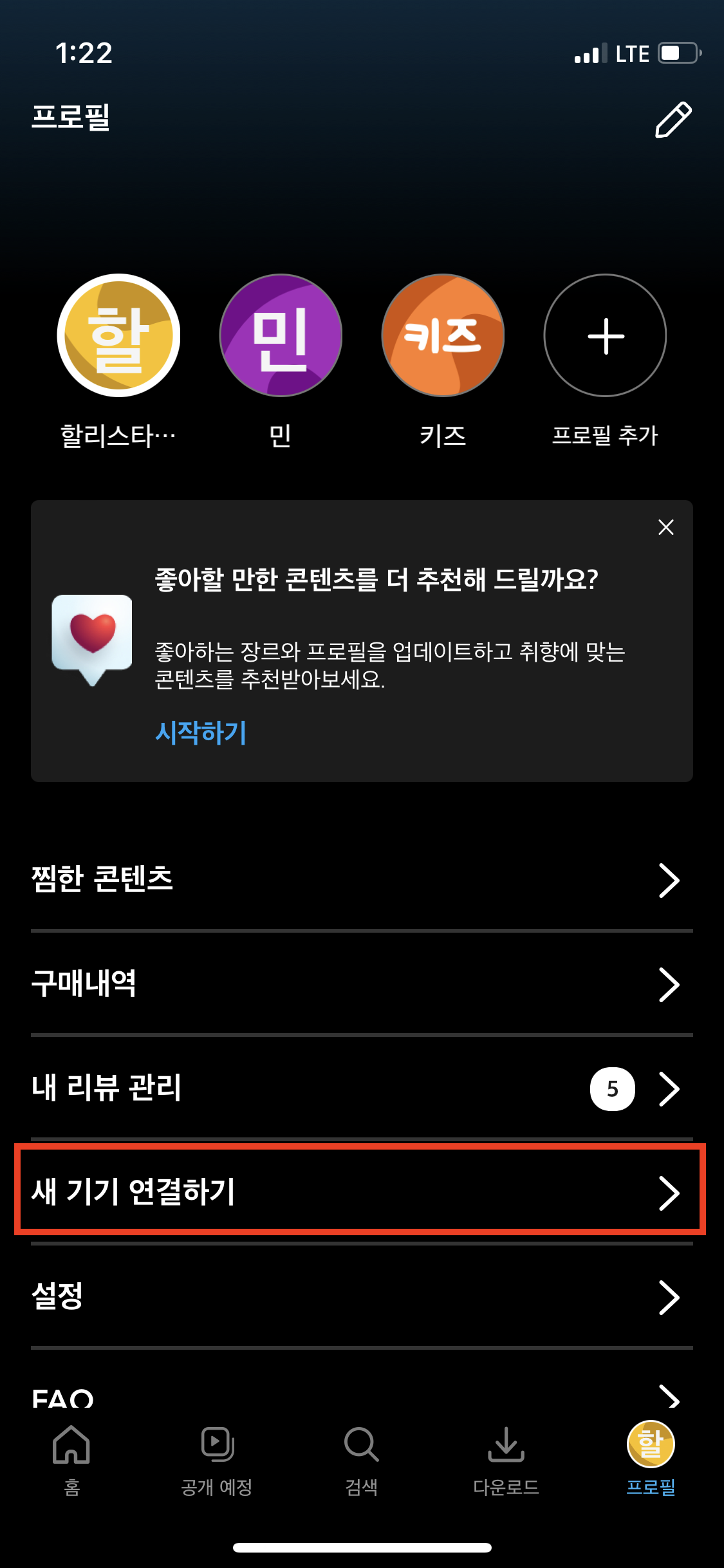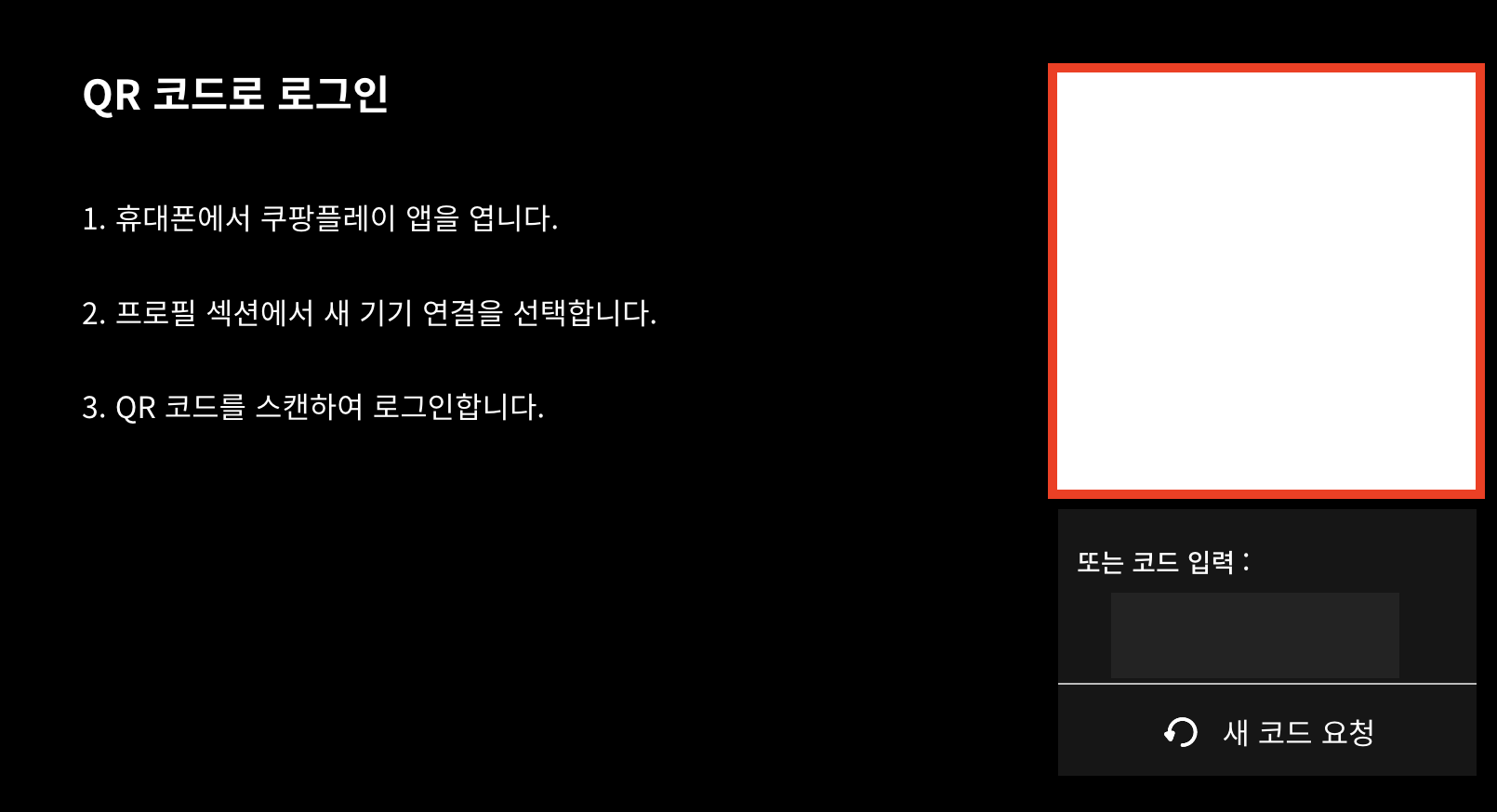 QR코드 인증은 쿠팡플레이 앱 - [프로필] - [새 기기 연결하기]를 누르면