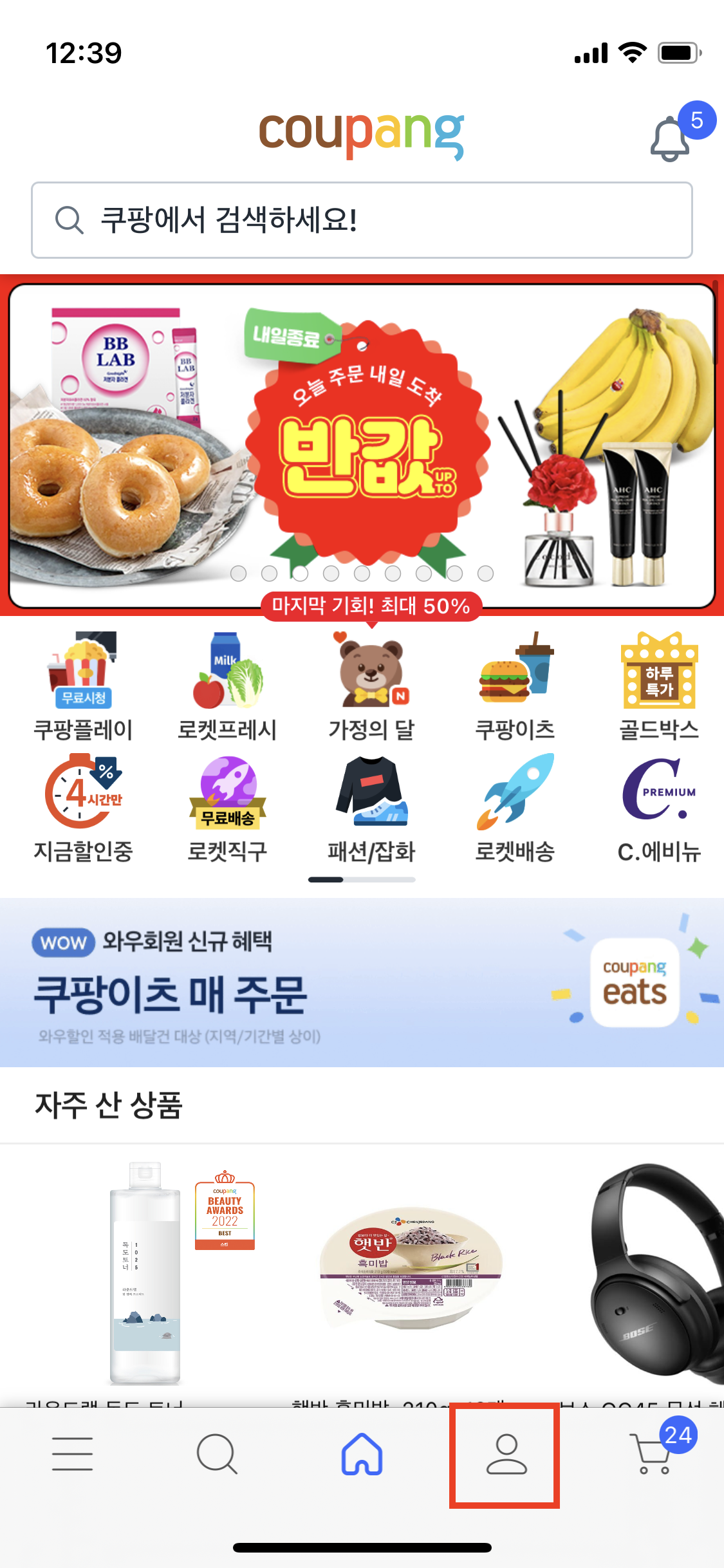 먼저 쿠팡앱을 켜주세요. 그런 다음 첫 번째 사진처럼 4번째 아이콘을 클릭하신 뒤,