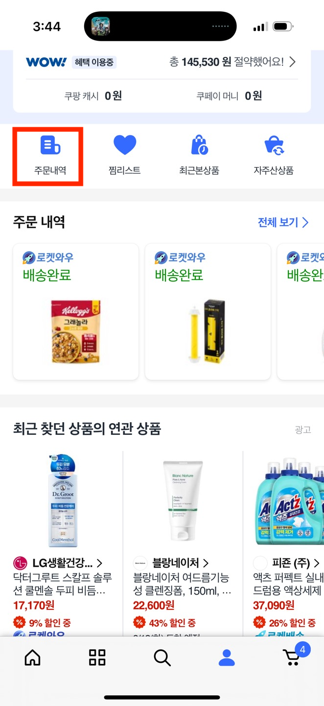 - 쿠팡 앱 실행 → 하단 [마이쿠팡] 클릭