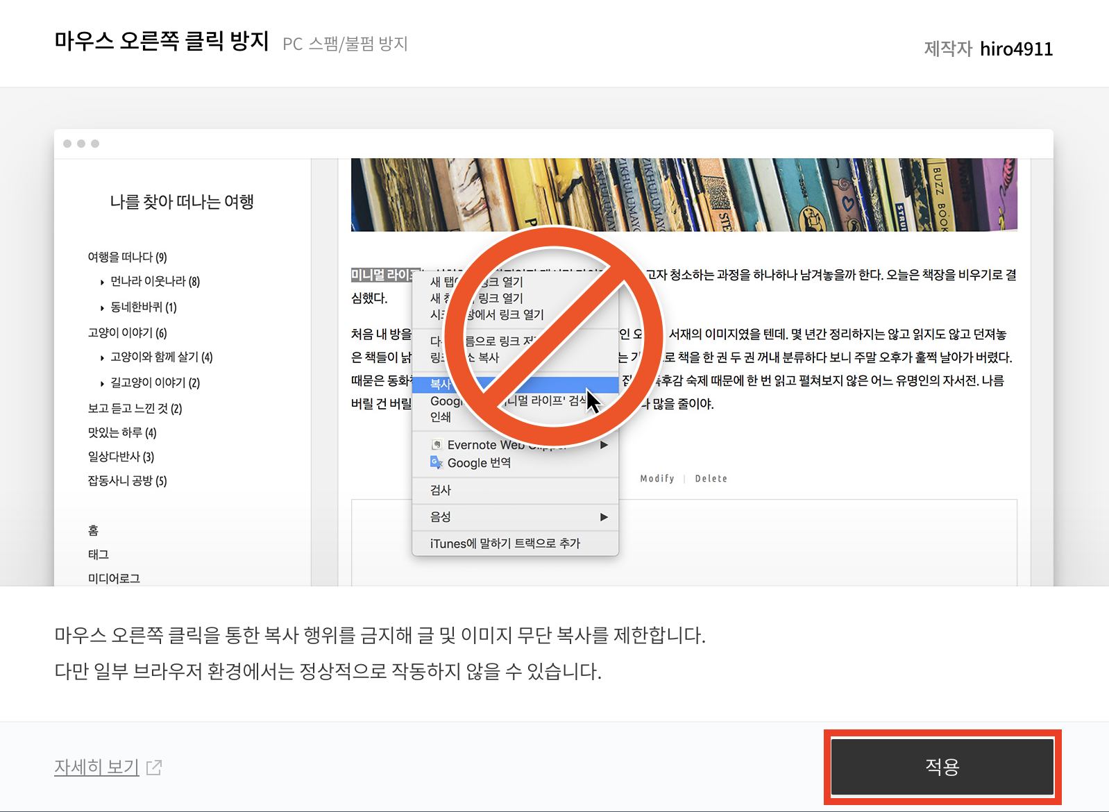 그다음 밑에 있는 [적용]을 눌러주시면 티스토리 마우스 오른쪽 클릭 방지 방법이 끝이 납니다!