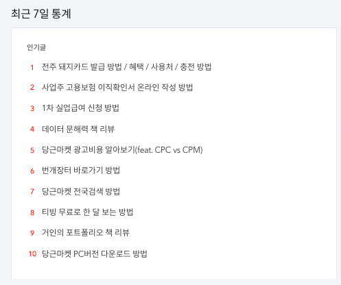 이후 밑으로 내리면 [최근 7일 통계]가 뜨는데 글 옆에 커서를 가져가면 [통계] 버튼이 생깁니다.