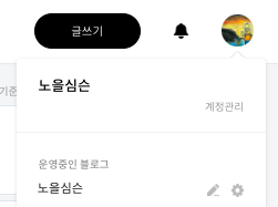 티스토리 오른쪽 상단에 있는 이미지를 클릭 후 톱니바퀴 버튼을 클릭해주세요.