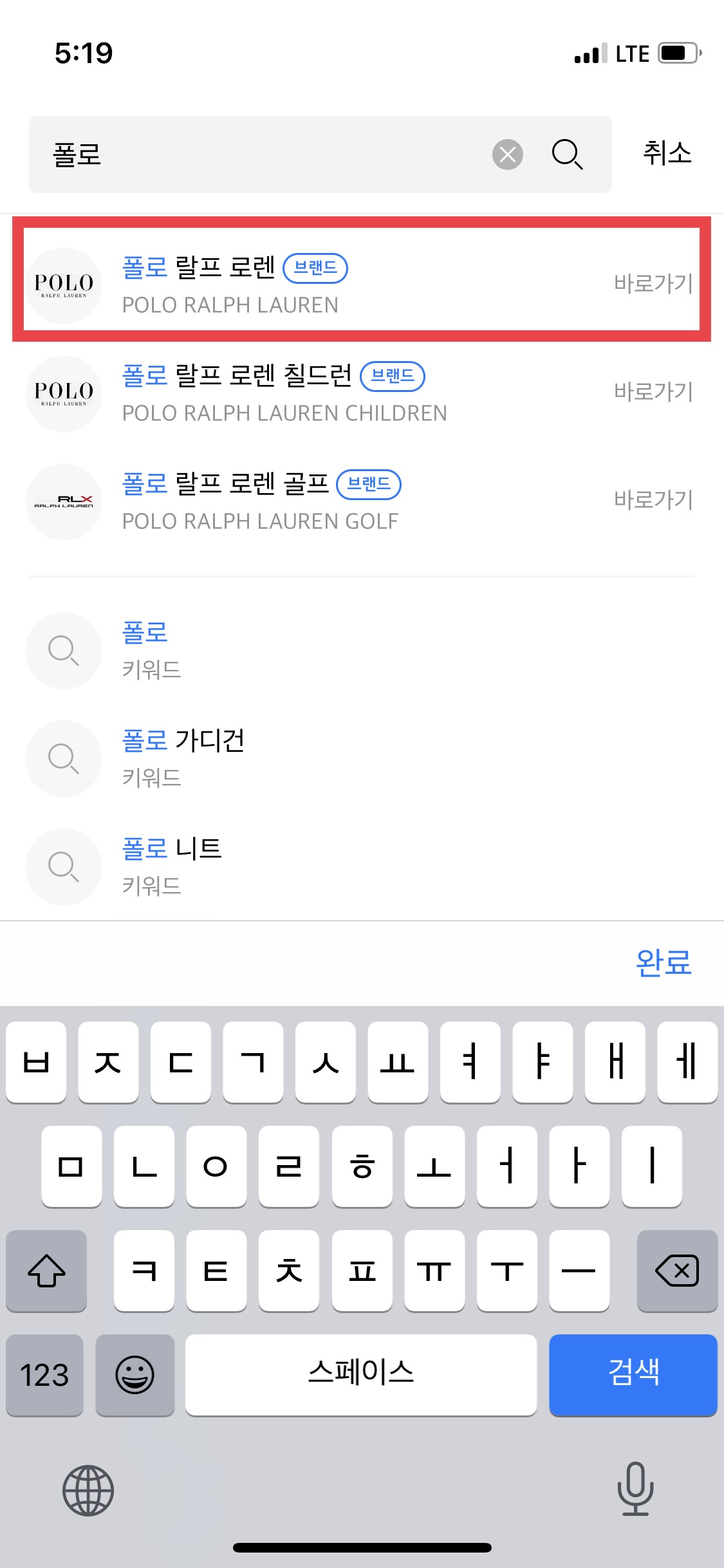 검색창을 눌러서 폴로 랄프 로렌 브랜드를 검색해주세요.