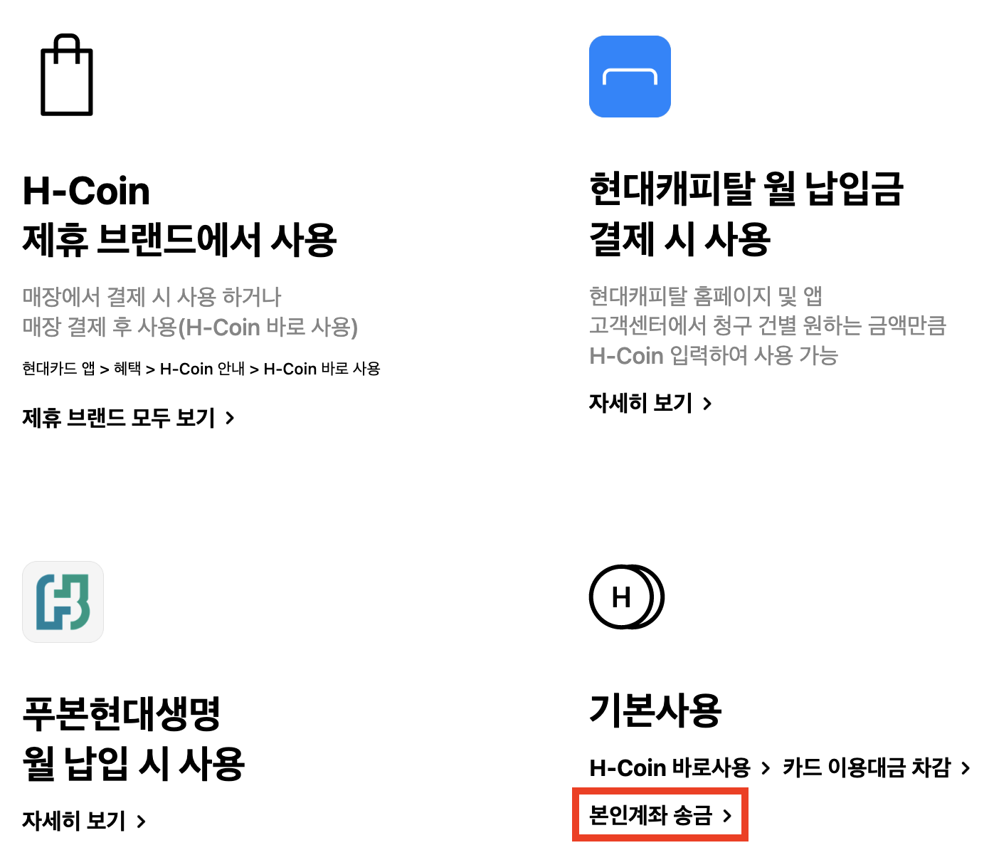 그런 다음 밑으로 내리면 H-coin 사용안내가 나오는데 [본인계좌 송금]을 눌러주세요.