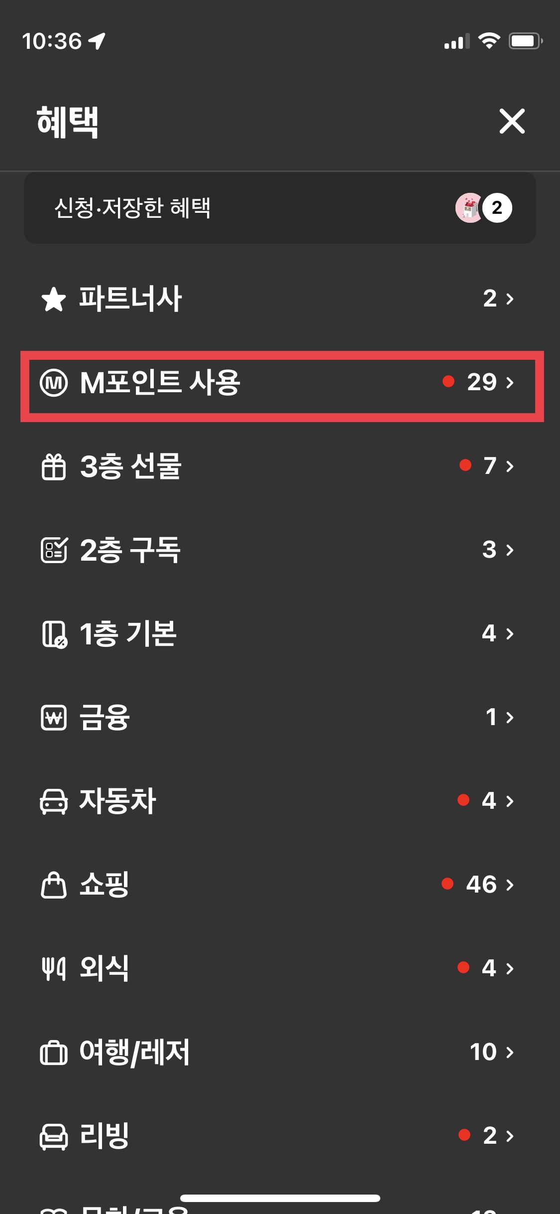 그런 다음 밑으로 쭉 내리시면 [M포인트사용]이 있는데 눌러주세요.