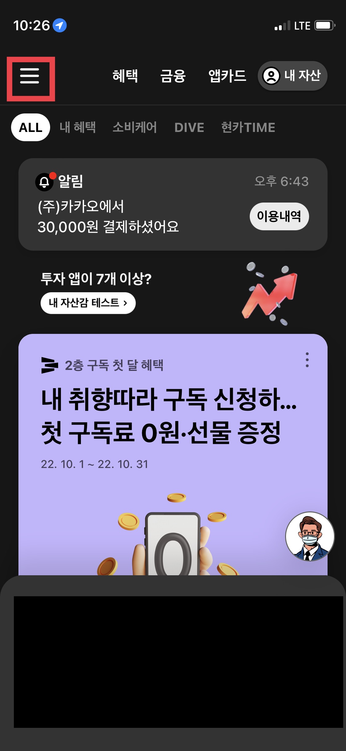 먼저 현대카드 앱을 켜주세요. 그리고 첫 번째 사진처럼 혜택을 눌러주세요.