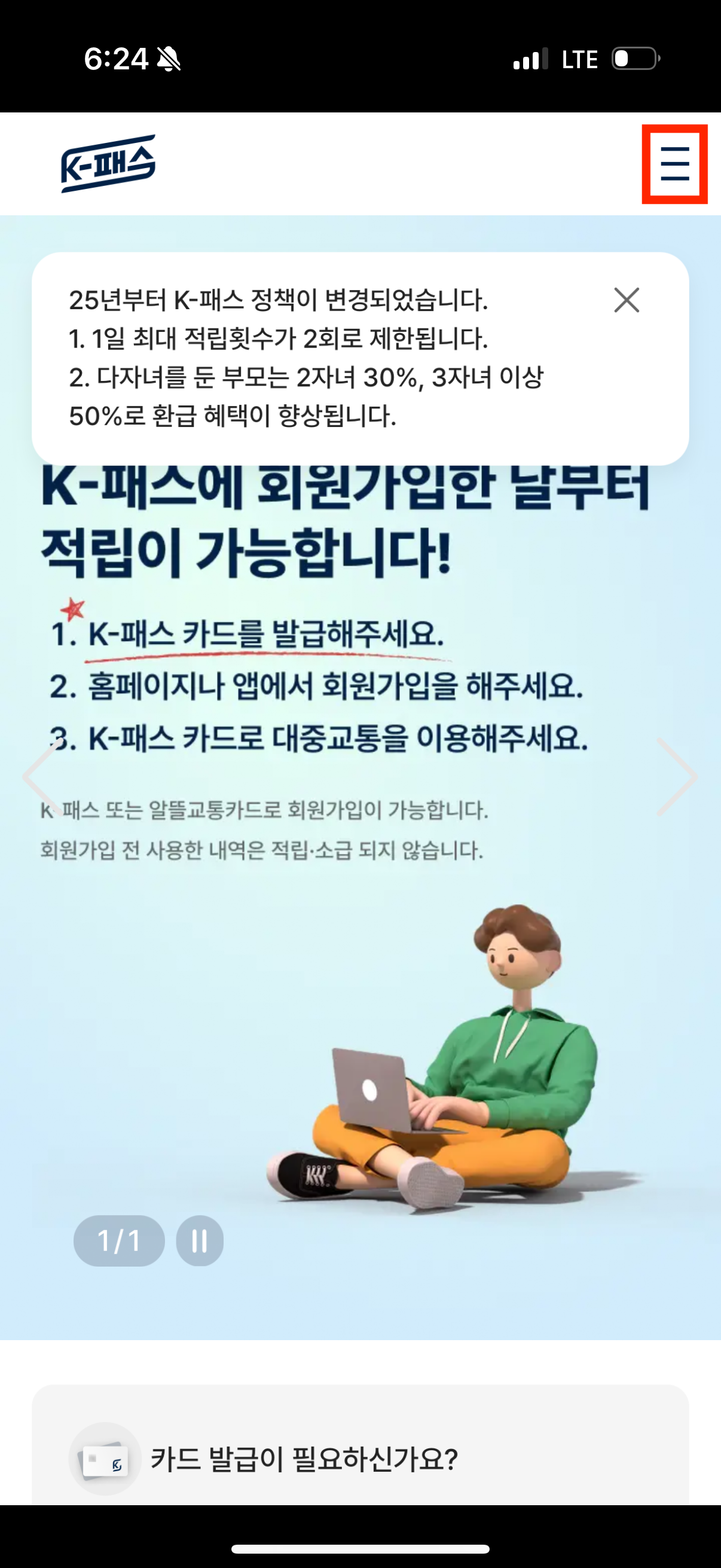 - K패스 앱 실행 → 상단 ≡ 메뉴 클릭