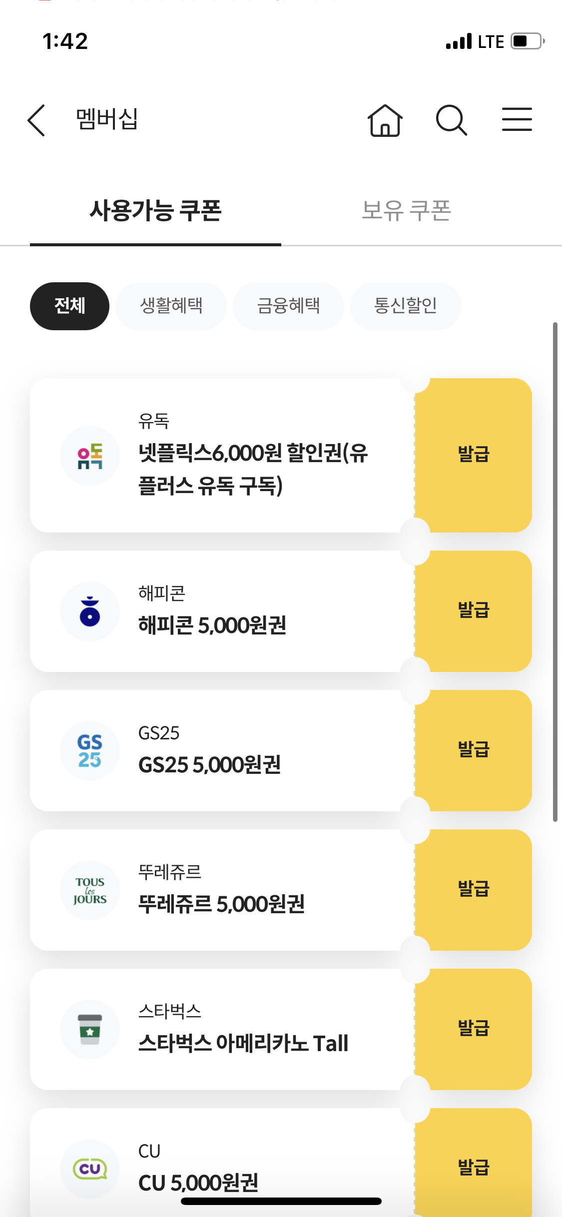 편의점, 뚜레쥬르, 스타벅스 등 쏠쏠하게 사용할 수 있는 쿠폰이 많아요.
